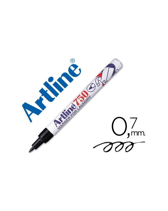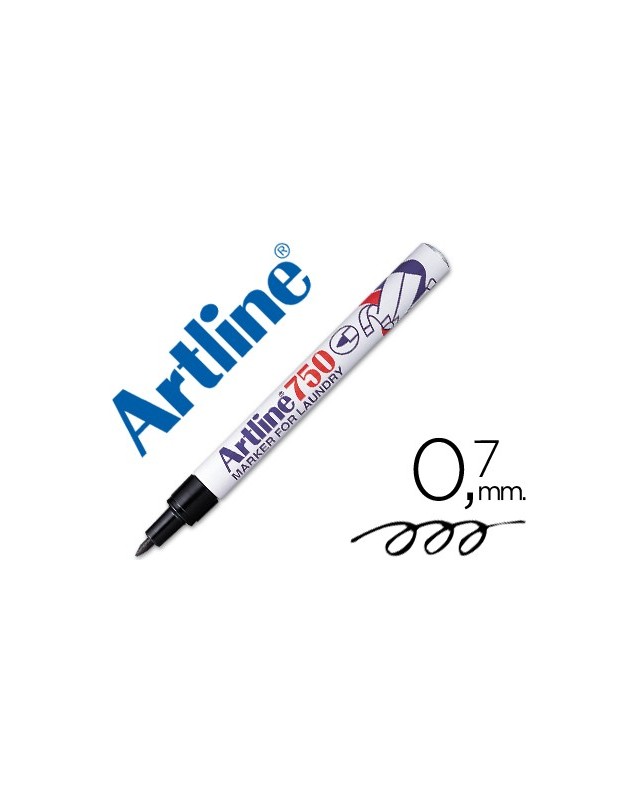 Especialmente indicado para los tejidos. Muy útil en lavanderías, hoteles, guarderías, uso doméstico, etc. Punta redonda de fibra acrílica. Cuerpo de aluminio. Tiempo de secado: 2 segundos. Resistente a las inclemencias meteorológicas y a las altas temperaturas. Color negro. Longitud de escritura: 250 m. Trazo de 0,7 mm.