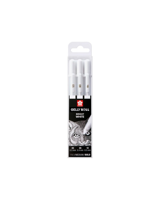 El set de tres rotuladores Gelly Roll de Sakura es un set ideal para los amantes del arte. Con tinta gel blanca, estos rotuladores vienen en grosores de 0.5, 0.8 y 1.0, lo que permite crear desde delicados detalles hasta trazos más audaces. Ideales para resaltar sobre fondos oscuros, ofrecen una fluidez excepcional y un acabado brillante. Perfectos para ilustraciones,caligrafía y manualidades, su versatilidad los convierte en una herramien ta imprescindible en cualquier caja de arte. Además, su diseño ergonómico asegura comodidad durante largas sesiones de creación, haciendo que cada proyecto sea un placer.