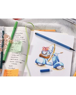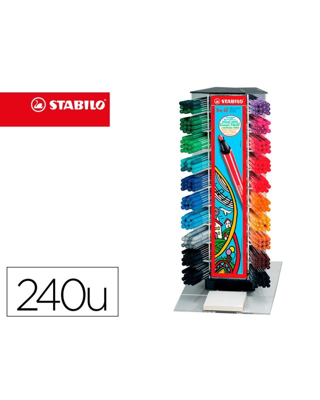 Expositor de plástico con 240 rotuladores premium Stabilo Pen 68 y bloc deprueba. Rotulador de alta calidad con punta de fibra e intensos colores p ara trazos fuertes y amplias zonas a colorear. Pigmentos seleccionados congran brillo y luminosidad. Punta media resistente. Ancho de trazo 1 mm. I nodoro, con tinta al agua. Tapón ventilado. Hasta 24 horas destapados sin secarse. Punto de referencia en el mercado de los rotuladores, indispensable en cualquier sección. Premios al diseño: Spiel Gut Premio 2017.