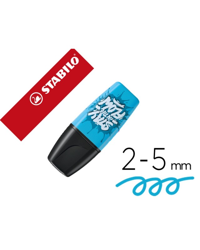 Marcador fluorescente mini StabiloBoss Mini by Snooze One. Mensajes geniales diseñados en estilo grafiti diseñadas por el artista Snooze One hacen de este fluorescente toda una declaración. Con la probada calidad del StabiloBoss combinada con un diseño pequeño y actual. Tecnología Stabilo anti-secado: 4 horas de protección para concentrarse en el trabajo. 2 anchos de trazo: 2 + 5 mm. Tinta con base acuosa.