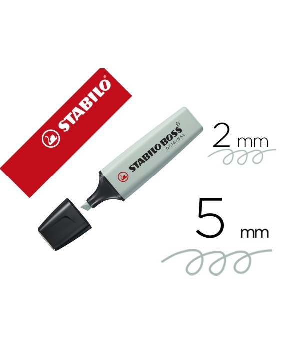 Rotulador fluorescente Stabilo Boss Original Pastel Nature Colors. Antisecado, hasta 4 horas destapado sin secarse para poder concentrarse en el trabajo. Resistente a la luz en todo tipo de papel normal, térmico y fotocopias. Punta biselada. Trazo de 2 a 5 mm. Color verde tierra.