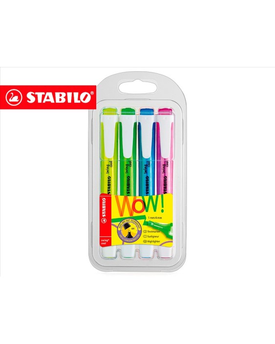 Rotuladores fluorescentes. Con tecnología anti secado (4 horas destapado sin secarse). Tinta a base de agua, resistente a la luz en todo tipo de papel: normal, fax, fotocopia, etc. Capuchón ventilado. Punta biselada. Modelo plano de bolsillo. Trazo de 2 a 5 mm.