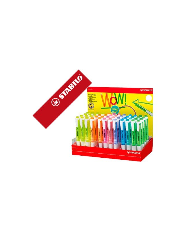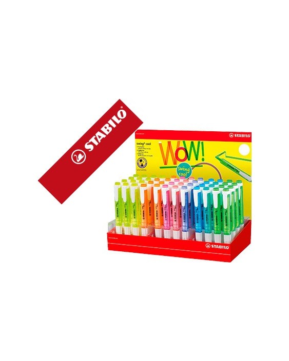 Expositor con 48 marcadores fluorescente Stabilo swing cool. Modelo plano de bolsillo con práctico clip. Grip anti-deslizante con acabado mate. Tecnología Antisecado: 4 horas de protección para concentrarse en el trabajo. 2 anchos de trazo 1 + 4 mm. Tapón ventilado. Tinta con base al agua.