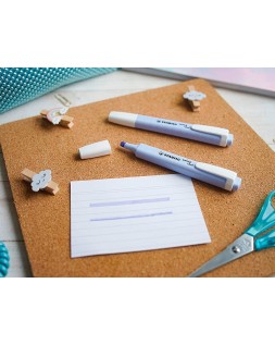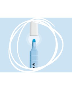 Rotuladores fluorescentes en colores pastel. Con tecnología anti secado (4 horas destapado sin secarse). Tinta a base de agua, resistente a la luz en todo tipo de papel: normal, fax, fotocopia, etc. Capuchón ventilado. Punta biselada. Modelo plano de bolsillo. Trazo de 2 a 5 mm.