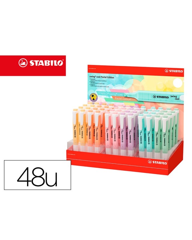 Expositor con 48 marcadores Stabilo swing cool Pastel Edition. Tecnología Stabilo Antisecado: 4 horas de proteccion antisecado para concentrarse en el trabajo. Modelo plan de bolsillo con práctico clip. 2 anchos de trazo: 1 +4 mm. Zona de agarre antideslizante. Tapón ventilado. Tinta con base acuosa. Colores pasteles que están de moda. Calidad y estilo en un solo producto.