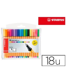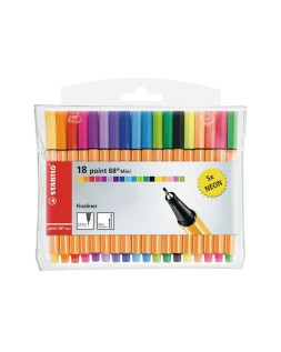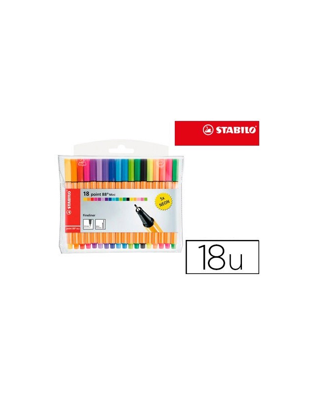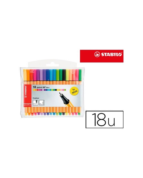 Rotulador con punta de fibra y refuerzo metálico. Formato mini del clásico. Escritura fina, apto para reglas y plantillas. Capuchón ventilado. Tinta con base de agua. Punta fina. Trazo de 0,4 mm. Incluye 18 rotuladores de colores:13 estándar + 5 neón.