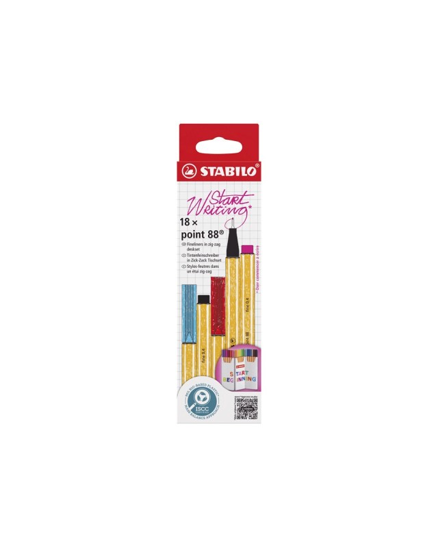 El rotulador con punta fina Stabilo Point 88 en color negro es uno de los más populares en Europa, conocido por su diseño ergonómico y la durabilidad de sus materiales. Ideal para tareas escolares, profesionales y artísticas, este rotulador ofrece precisión y comodidad en cada trazo. Caja zigzag de 18 unidades colores surtidos.