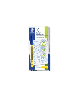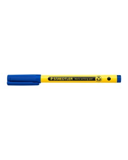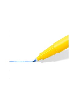 Rotulador Staedtler Fineliner con cuerpo en colores amarillo y negro y capuchón en color de la tinta. Carcasa fabricada en un 97% de plástico reciclado (cuerpo, capuchón y embellecedor) según ISO 14021. Punta antisecado Dry Safe resistente a la presión. Lavable sobre la mayoría de tejidos. PuntaF (aprox. 0,6 mm). Color azul.