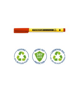 Rotulador Staedtler Fineliner con cuerpo en colores amarillo y negro y capuchón en color de la tinta. Carcasa fabricada en un 97% de plástico reciclado (cuerpo, capuchón y embellecedor) según ISO 14021. Punta antisecado Dry Safe resistente a la presión. Lavable sobre la mayoría de tejidos. PuntaF (aprox. 0,6 mm). Color rojo.
