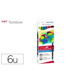 Rotulador doble punta fina y pincel. Punta fina super resistente para trazos precisos y punta ancha de pincel flexible que permite crear diferentes anchos de trazos según la presión ejercida. Se adapta fácilmente a la manogracias a su longitud y su forma delgada. Ideal para Lettering, Stamping, Manga, Urban Sketching, Bocetos, Acuarela, Watercoloring, etc. Tinta base agua libre de acidos e inodoro. Colores acuarelables que pueden mezclarse entre sí creando multiples transiciones de color. Estuche de cartón 6 col ores primarios.