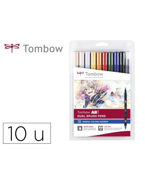 Rotulador base agua doble punta. La punta pincel permite crear diferentes anchos de trazo según la presión ejercida, mientras que la punta fina permite trazar con precisión y exactitud. Colores acuarelables que pueden mezclarse entre sí creando llamativas transiciones de color. Los colores son libres de ácidos e inodoros. No son resistentes a la luz. Perfecto para hand lettering, caligrafía, acuarela, diarios creativos (bullet journal), ilustraciones, dibujo de cómics, manga, urban sketching, stamping, bocetos, ... ¡y mucho más! Estuche 10 colores Manga Shonen.