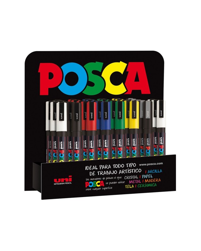 Marcador de pintura no permanente, base agua. No es tóxico Punta en forma de bala de poliéster PC3M de 0,9mm - 1,3mm Pinta sobre cualquier superficie: metal , vidrio, plástico, piedra, tela, terracota, porcelana y muchos más Color opaco: dejar secar después de la aplicación y la nueva cap de pintura, cubrirá completamente el color anteiror. Expositor 36 uds (6 uds blanco, 5 negro, 5 rojo, 5 azul, 5 verde, 5 amarillo y 5 plata)