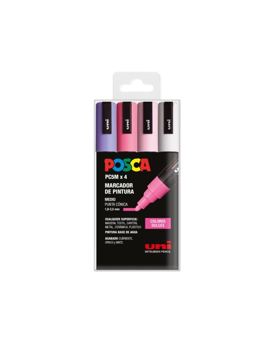 Marcador de pintura no permanente, base agua. No es tóxico Punta en forma de bala de poliéster PC5M de 1,8mm - 2,5mm Pinta sobre cualquier superficie: metal , vidrio, plástico, piedra, tela, terracota, porcelana y muchos más Color opaco: dejar secar después de la aplicación y la nueva cap de pintura, cubrirá completamente el color anteiror. Estuche de 4 colores dulces: lila, rosa, rosa claro y blanco