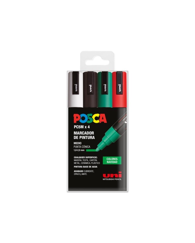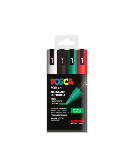 Marcador de pintura no permanente, base agua. No es tóxico Punta en forma de bala de poliéster PC5M de 1,8mm - 2,5mm Pinta sobre cualquier superficie: metal , vidrio, plástico, piedra, tela, terracota, porcelana y muchos más Color opaco: dejar secar después de la aplicación y la nueva cap de pintura, cubrirá completamente el color anteiror. Estuche de 4 colores navidad: blanco, negro, verde y rojo