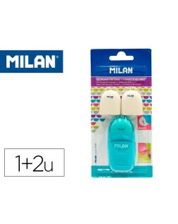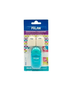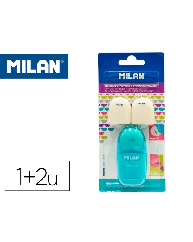 Original sacapuntas de la marca Milan CAPSULE, material plástico con goma de borrar incluída y dos recambios COMBINACIÓN DE GOMA Y SACAPUNTAS. EL SACAPUNTAS TIENE UNA CUCHILLA DE ACERO AL CARBONO AFILADA Y RESISTENTE, IDEAL PARA TODO TIPO DE LÁPICES ARTÍCULO CON CUCHILLA DE SEGURIDAD. ESTE SISTEMA EVITA QUE SE PUEDA SEPARAR LA HOJA DEL CUERPO DEL SACAPUNTAS,SIENDO ÓPTIMO PARA USO ESCOLAR. COLORES SURTIDOS: AZUL, LILA, ROSA, VERDE