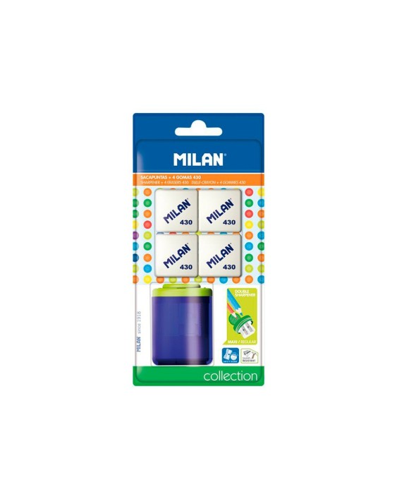 Sacapuntas milan collection plastico 2 usos + 4 gomas de borrar 430