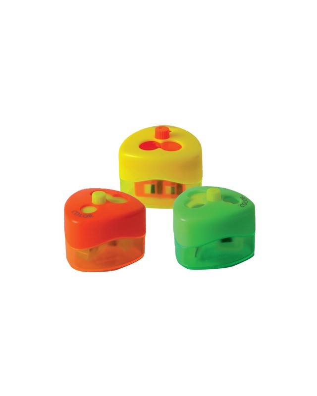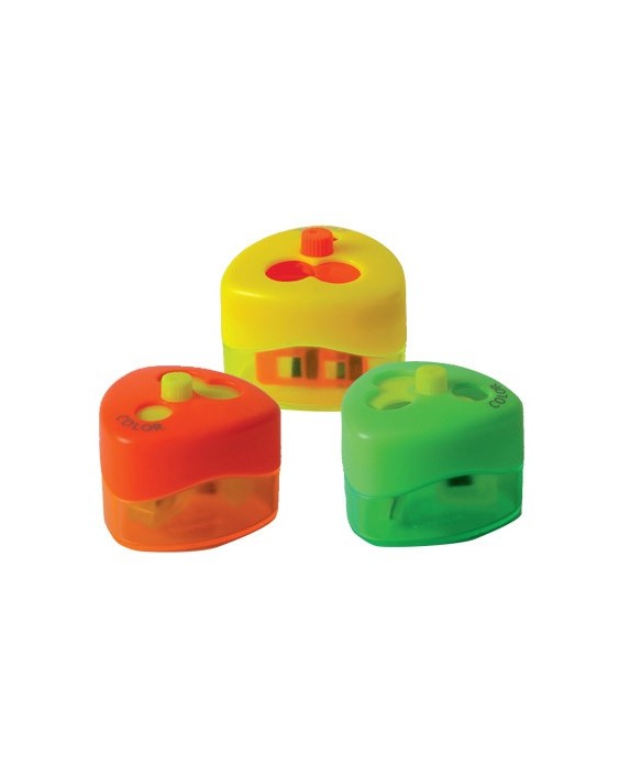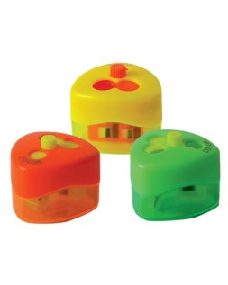 Sacapuntas de interior y cobertura de plástico. Para lápices y ceras. Con tapa, que lo hace más seguro para los niños. Este modelo fue reconocido internacionalmente por su diseño innovador y fue premiado en 2006 por la Asociación de la Prensa del sector de la papelería con el ISPA & Innovation Award. Colores surtidos. Tres usos.