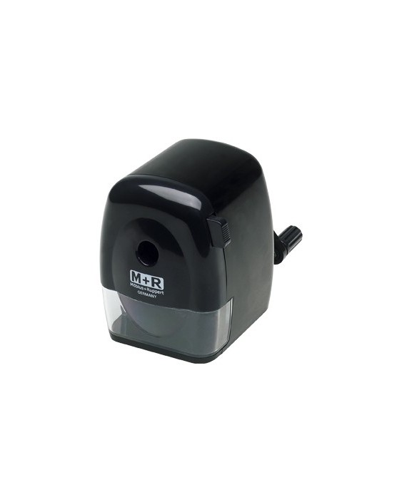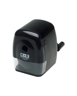 Sacapuntas metálico y cobertura de plástico. De sobremesa, incluye agarre para su sujeción. Manual con manivela y abrazadera que evita la rotura del lápiz. Función de parada automática cuando la punta está suficientemente afilada. Permite selección del diámetro del lápiz. Disponible en color negro y en color rojo. Un uso. Medidas: 71 x 110 x 95 mm.