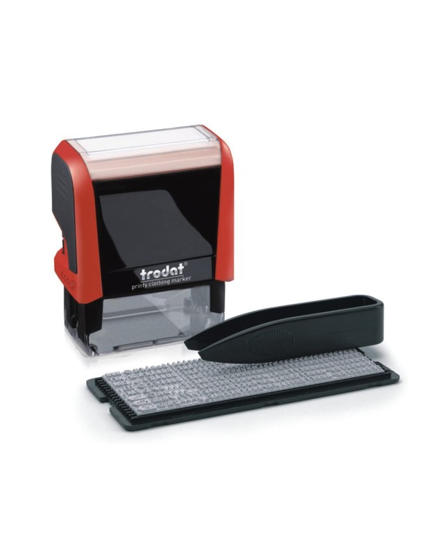 Sello de entintaje automático para componer sus propios textos. Incluye una imprentilla de 288 caracteres con letras, números y símbolos de uso frecuente, pinzas para colocarlos y un estuche para guardarlos. Incorpora un cartucho de tinta para textiles y una tira de tela para planchar. Espacio para componer hasta 3 líneas de texto. Tinta resistente al lavado en color negro.