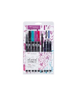 Set que contiene todo el material necesario para el hand lettering avanzado. Incluye manual de instrucciones con recomendaciones y trucos para mezclar colores. Productos incluidos: 4 rotuladores ABT Dual Brush con punta flexible ancha para letras grandes y punta fina para detalles. Colores: negro (ABT-N15), deep magenta (ABT-685), cherry (ABT-815) y sea blue (ABT-373). Blender Pen incoloro (ABT-N00) para suavizar y mezclar colores. Lápiz degrafito de alta calidad MONO 100 a prueba de borrones. Grado de dureza 3H (muy duro). Rotulador de caligrafía Fudenosuke en dos versiones: punta fi na pincel firme grado de dureza 1 (duro) y punta fina pincel blanda flexible grado de dureza 2. Tinta color negro. Rotulador permanente MONO twin cocon doble punta: fina y ancha. Tinta color negro. Goma de