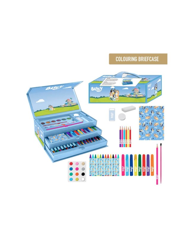 Diversión y creatividad van de la mano con este increíble set de papeleríacoloreable en maletín de Bluey. Perfecto para los pequeños artistas y fan s de Bluey, este set ofrece una experiencia única para colorear, dibujar yexplorar su imaginación junto a su perrita favorita y su familia.