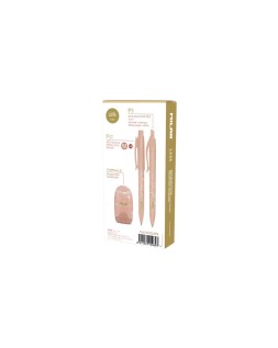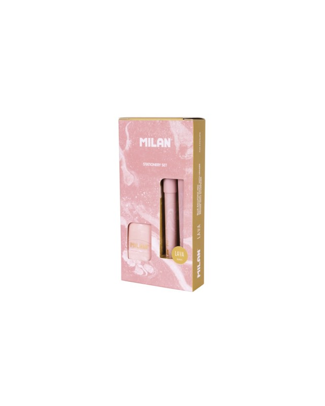 Set de escritura de la serie Lava, inspirada en las erupciones volcánicas y en el movimiento de la roca fundida, ideal para regalo. Contiene un bolígrafo P1 con tinta azul, un portaminas de 0,5 mm de grosor y dureza HB congoma Milan extra-larga con mecanismo rotatorio, y un afilaborra diseño Ca psule con goma de borrar y sacapuntas con depósito y cuchilla de seguridad. Diseño original de los productos creado por el departamento de I+D. Medidas bolígrafo: 14,1x1,7 cm. Medidas portaminas: 14,4x1,5x1,1 cm. Medidas afilaborra: 6,5x3,5x2,4 cm. Color rosa. Gomas y minas de recambio disponibles.