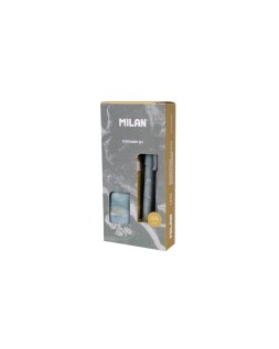 Set de escritura de la serie Lava, inspirada en las erupciones volcánicas y en el movimiento de la roca fundida, ideal para regalo. Contiene un bolígrafo P1 con tinta azul, un portaminas de 0,5 mm de grosor y dureza HB congoma Milan extra-larga con mecanismo rotatorio, y un afilaborra diseño Ca psule con goma de borrar y sacapuntas con depósito y cuchilla de seguridad. Diseño original de los productos creado por el departamento de I+D. Medidas bolígrafo: 14,1x1,7 cm. Medidas portaminas: 14,4x1,5x1,1 cm. Medidas afilaborra: 6,5x3,5x2,4 cm. Color verde. Gomas y minas de recambio disponib