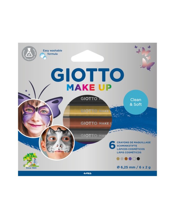 Set de 6 lápices cosméticos metalizados con una nueva formulación más suave y fácilmente lavable de la piel. Realizados en madera de cedro y mina gigante de 6,25 mm de diámetro. Cada lápiz viene identificado con el nombre del color y botón plateado en el extremo.