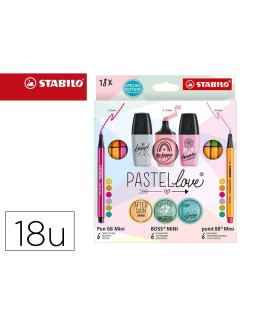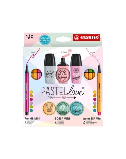 Estuche Stabilo Pastellove Collection con 6 rotuladores premium Pen 68 Mini, 6 rotuladores punta fina point 88 Mini, 6 marcadores mini Pastellove 2.0. Pen 68 Mini: Alto brillo y luminosidad. Tinta inodora a base de agua. Punta resistente tamaño M (aprox. 1 mm de grosor) para un colorido homogéneo. Tapón ventilado. Puede estar hasta 24 horas destapado sin secarse. Point 88 Mini: Rotulador punta fina Stabilopoint 88 Mini. El punta fina nº1 deEuropa en formato Mini. Diseño hexaginal rayado, conocido en todo el mund o. Punta con refuerzo de metal para larga duración. Ancho de línea 0.4 mm.No se seca si se deja sin tapón durante largos periodos. Tapón ventilado. Boss Mini Pastellove Edition 2.0: El clásico StabiloBoss Original con un un formato mini. Colores pastel, suave y de moda.