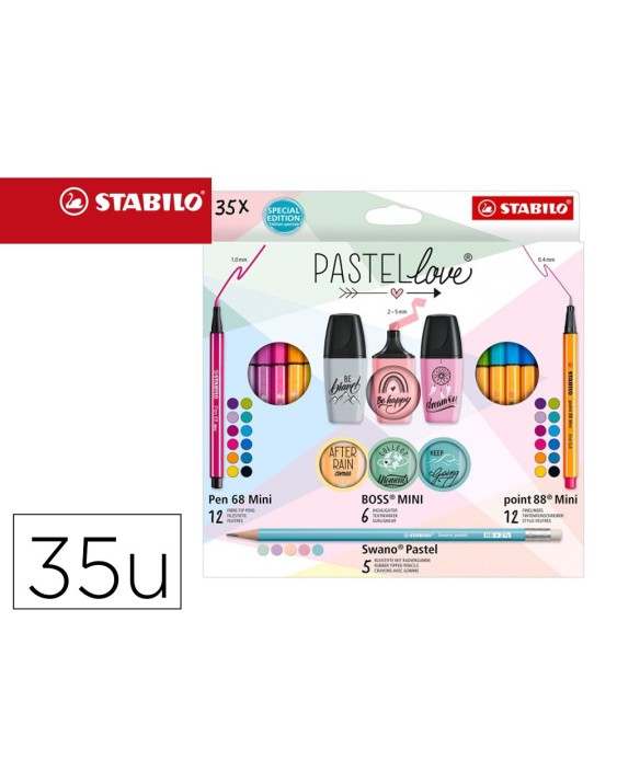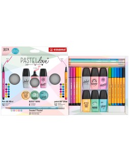 Estuche Stabilo Pastellove Collection con 12 rotuladores premium Pen 68 Mini, 12 rotuladores punta fina point 88 Mini, 6 marcadores mini Pastellove 2.0 y 5 lápices de grafito Swano Pastel. Pen 68 Mini: Alto brillo y luminosidad. Tinta inodora a base de agua. Punta resistente tamaño M (aprox. 1 mm de grosor) para un colorido homogéneo. Tapón ventilado. Puede estar hasta 24 horas destapado sin secarse. Point 88 Mini: Rotulador punta fina Stabilopoint 88 Mini. El punta fina nº1 de Europa en formato Mini. Diseño hexaginal rayado, conocido en todo el mundo. Punta con refuerzo de metal para larga duración. Ancho de línea 0.4 mm. No se seca si se deja sin tapón durante largos periodos. Tapón ventilado. Boss Mini Pastellove Edition 2.0: : El clásico StabiloBoss Original con un format