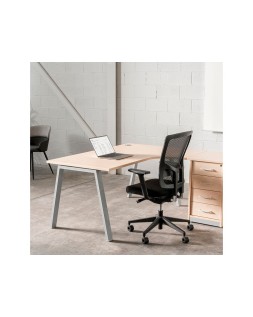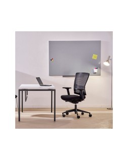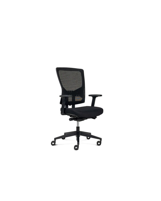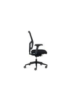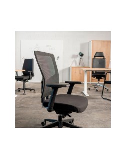 Silla de oficina profesional con el asiento tapizado en tela ignífuga sobre interior de espuma inyectada. Asiento regulable en altura mediante pistón de gas y regulable en profundidad (trasla). Respaldo regulable en altura tapizado en malla negra transpirable con soporte lumbar para adaptar el respaldo a la curvatura de la espalda y evitar dolencias. Sistema sincro de inclinación del respaldo con palanca de bloqueo del recorrido en cualquier punto. Pomo para la regulación de la inclinación del respaldo en función del peso del usuario. Base de polímero técnico de gran resistencia y estabilidad. Brazos de serie regulables en altura. Admite ruedas de parqué RD-917. Fácil montaje.