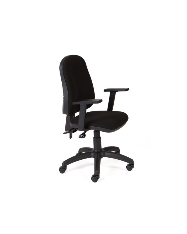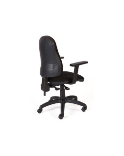 Silla giratoria regulable en altura. Respaldo alto regulable y asiento tapizado en tela ignífuga. Pistón: de gas elevable. Base: de nylon. Altura de la silla: 99 +13 cm. Altura del respaldo: 49 cm. Altura del asiento: 46 cm. Ancho del asiento: 46 cm. Profundidad del asiento: 44 cm. Brazos: regulables en altura 8 cm. Ruedas: especiales parqué 6 cm diámetro. Horas de uso: 8 horas. Peso de la silla /peso soportado: 14 kg /125 kg. Certificado UNE 1335 -1/ -2.