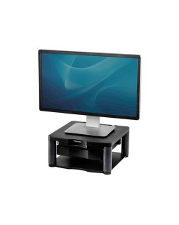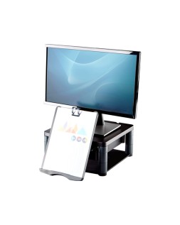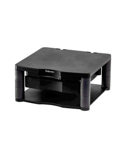 Coloca la pantalla a una altura cómoda y mantiene el puesto de trabajo organizado. Soporta pantallas de hasta 36 kg. Incluye cajón de almacenamiento de 51 mm y un atril. Se pueden elegir entre 5 alturas diferentes, de 64 mm a 165 mm. Acreditado con ISO 9241 por Fira Internacional y por la Consultoría Ergonómica Internacional Independiente. Medidas: 335 x 344 x 165 mm. Peso: 1,66 kg.