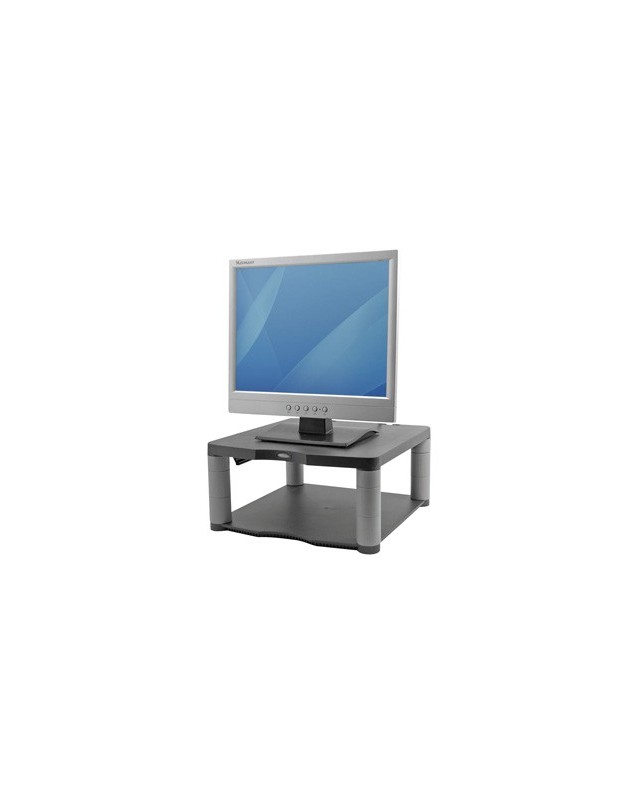 Soporta pantallas de hasta 36 kg, CRT o TFT/LCD de 21 . Fabricado en plástico 100% reciclado. Se puede ajustar a 5 alturas diferentes desde 64 mm a 165 mm. Base de plástico resistente que puede servir para guardar documentos. 1 año de garantía. Medidas: 335 x 344 x 165 mm. Peso: 2,20 kg.