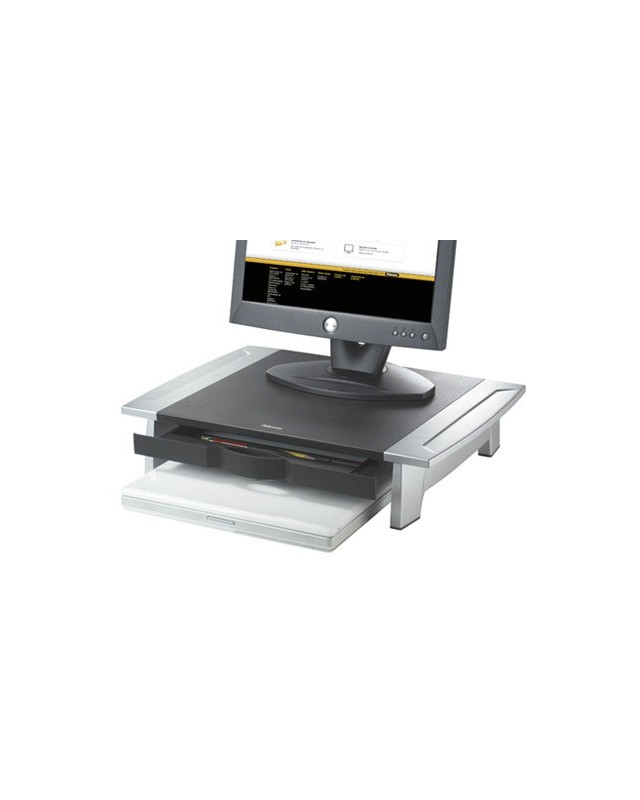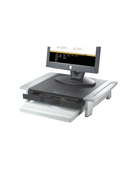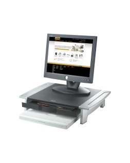 Soporte para monitor resistente, con diseño actual multiusos. Con espacio para guardar el portátil debajo y ahorrar espacio, y bandeja para organizar los artículos esenciales de oficina. Ajusta la pantalla para evitar las tensiones en el cuello. Posibilidad de elevar hasta 5 alturas de 100 mm - 150 mm. Soporta grandes pantallas de CRT o TFT de hasta 36 kg de peso. Medidas: 500 x 100/150 x 364 mm. Peso: 1,9 kg.