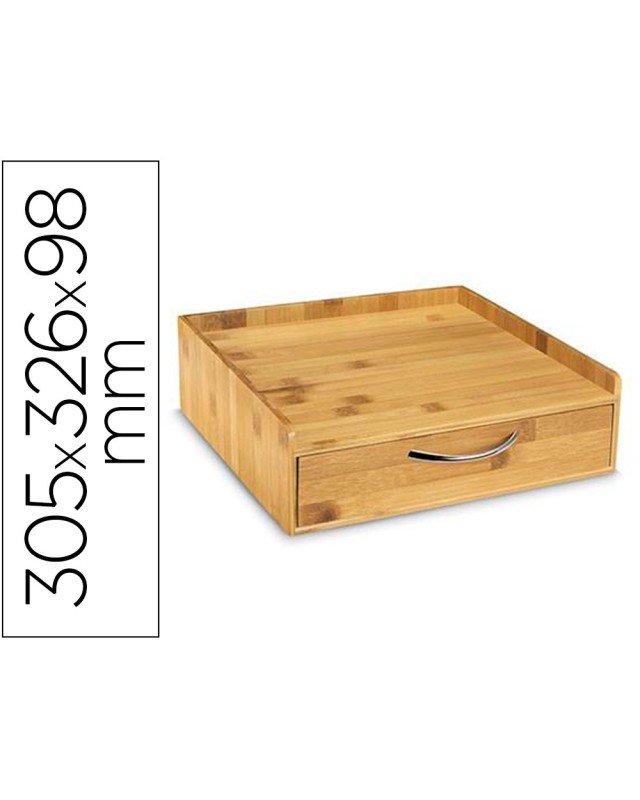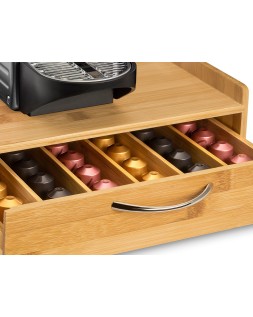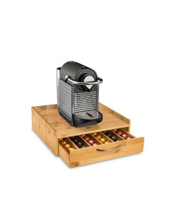 Soporte para cápsulas de café hecho de bambú. Soporte para cafeteras, ideal para optimizar el espacio. Adecuado para su uso en casa o en la oficina.Producto complementario de la gama actual Take a break. Cajón deslizante con 6 separadores para una óptima organización de sus cápsulas de café. Reciclable (excepto el mango de metal). No requiere montaje.Un barniz protector hace que el producto sea impermeable, cualquier mancha (café, té...) se puede limpiar perfectamente. Medidas : 30,50 x 32,68 x 9,80 cm. Anchura de las secciones: 2,54 cm. Puede contener 50 cápsulas de Nespresso o 35 deSpecial T. Soporta 10Kg de carga. Los productos de bambú suelen presentar irregularidades o matices de color. Peso: 1,81 kg.