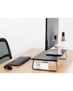 Soporte para monitor extraancho con diseño duradero y elegante. Plataforma con mucho espacio debajo para almacenar un teclado completo y accesorios. Base de acero que eleva el monitor a una altura de visualización para facilitar una correcta higiene postural y aumentar la productividad. Para monitores de hasta 32\" y 20 kg. Medidas: 600 x 260 mm.