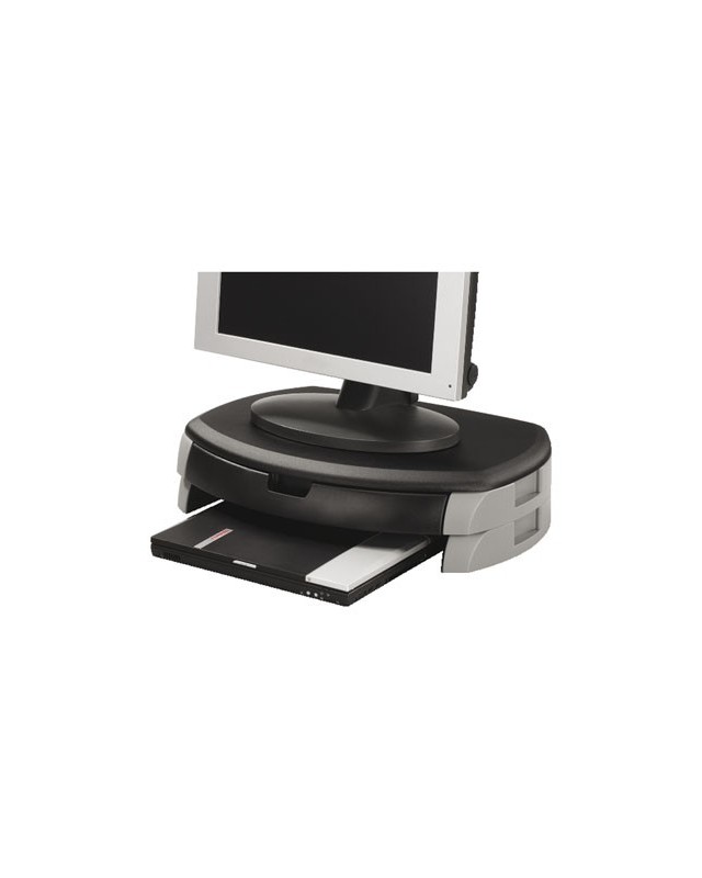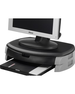 Soporta monitores de LCD hasta 20 , CRT o impresoras. La amplia plataforma extra sirve para colocar altavoces o una impresora. Robusto soporte trasero para asegurar que el monitor no se caiga hacia atrás. Cajón amplio extra con diferentes compartimentos para guardar los objetos de oficina. Espacio extra para colocar su teclado. Medidas: 583 x 120 x 335 mm. Peso: 2,7 kg.