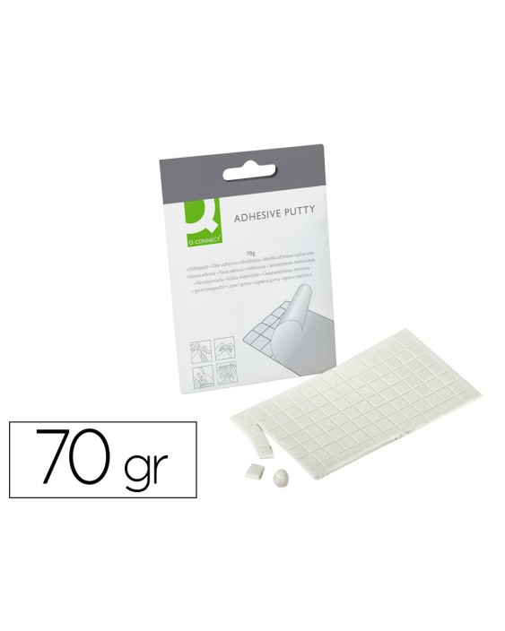 Masilla adhesiva precortada de quita y pon con múltiples aplicaciones. Para fijar cosas de poco peso en todas partes. Sustituye a la cinta adhesiva, grapas y chinchetas. Sin agujerear. No deja huella cuando se retira, puede volverse a usar. Contenido: 70 g.