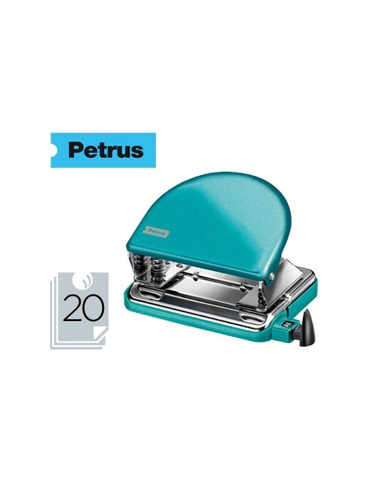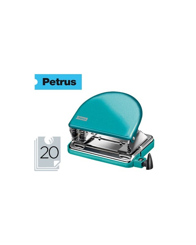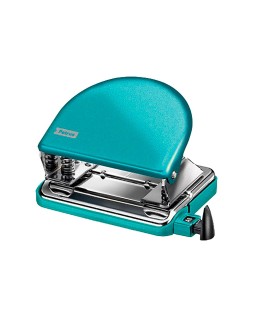 Taladrador completamente metálico. Capacidad de taladro hasta 20 hojas. Punzones más afilados que permiten taladrar con menos esfuerzo. Regleta tope con formatos impresos y ventana para mayor visibilidad y mejor fijación. Cubeta de plástico EVA de gran durabilidad. Garantía de 10 años. Medidas de la base: 140 x 94 mm.