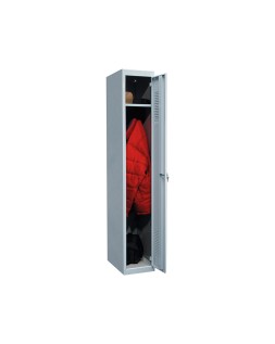 Taquilla metálica de 1 puerta de estética moderna y gran capacidad, perfecta para industrias y colectividades. Fácil montaje Pintura Epoxi RAL 7035 (Gris perla). Cerradura con llave incorporada. Portaperchas. Rejilla de ventilación. Portaetiquetas. Medidas: 30 x 180 x 50 cm.