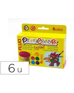 Estuche con 6 tarros 40 ml de pintura témpera líquida (6 colores fluorescenes surtidos). De Playcolor, garantía de calidad para hacer manualidades. Pintura sin disolventes. Sin parabenos, ni lo principales alérgenos. A partir de 3 años. Tarros con tapa de colores, fáciles de guardar. No ondula el papel. Gran viscosidad. Alta opacidad.