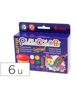 Estuche con 6 tarros 40 ml de pintura témpera líquida (6 colores glitter surtidos). De Playcolor, garantía de calidad para hacer manualidades. Pintura sin disolventes. Sin parabenos, ni lo principales alérgenos. A partir de 3 años. Tarros con tapa de colores, fáciles de guardar. No ondula el papel. Gran viscosidad. Alta opacidad.