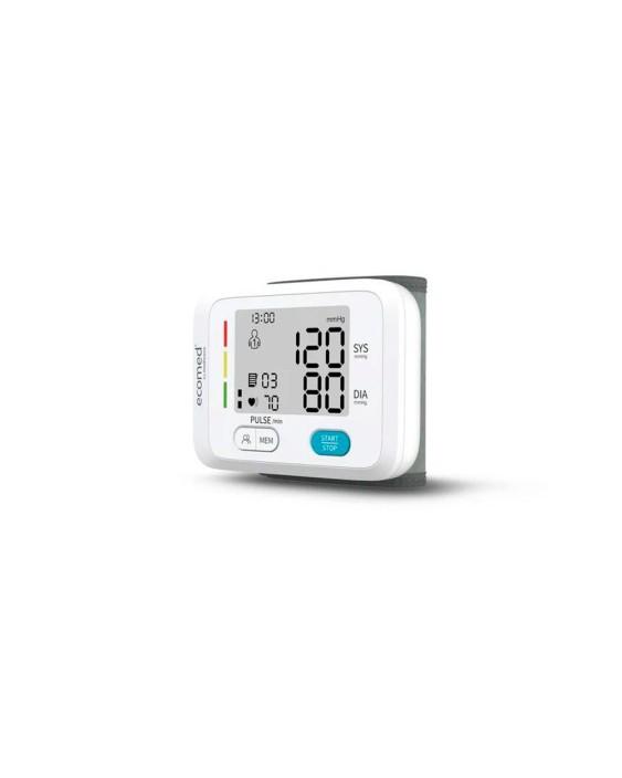 Monitor de presión arterial compacto de muñeca que permite a los clientes controlar su salud cardiovascular en cualquier momento y lugar, sin necesidad de manguitos voluminosos de brazo. Emplea la tecnología oscilométrica para ofrecer lecturas precisas de sistólica (57-255 mmHg), diastólica (25-195 mmHg) y pulso (40-199 lat/min), todo ello en una gran pantalla LCD de 49 x 36 mm que muestra también fecha, hora y nivel de batería, indispensable para usuarios sénior o con visión reducida. El dispositivo clasifica automáticamente cada medición según la escala OMS de colores tipo semáforo (verde-amarillo-rojo), facilitando la interpretación inmediata y fomentandola venta consultiva en la sección de salud y bienestar de la papelería. A demás, integra detección de arritmias pa