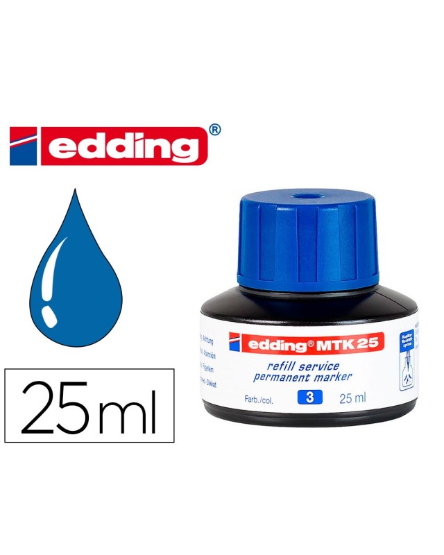 Tinta para rellenar con sistema capilar, ideal para rellenar de forma limpia y sencilla diversos marcadores permanentes edding. El frasco de recargade tinta contiene 25 ml. Simplemente hay que colocar la punta hacia abajo en el frasco de rellenado durante al menos una hora o, idealmente, durant e toda la noche. Y el marcador estará listo para volver a escribir. Sin adición de xileno ni tolueno. Color: azul