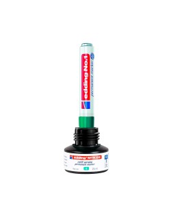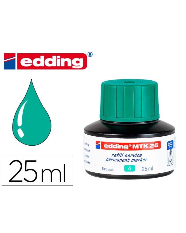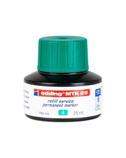 Tinta para rellenar con sistema capilar, ideal para rellenar de forma limpia y sencilla diversos marcadores permanentes edding. El frasco de recargade tinta contiene 25 ml. Simplemente hay que colocar la punta hacia abajo en el frasco de rellenado durante al menos una hora o, idealmente, durant e toda la noche. Y el marcador estará listo para volver a escribir. Sin adición de xileno ni tolueno. Color: verde