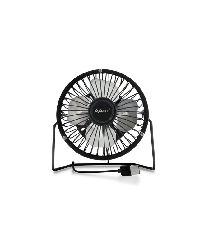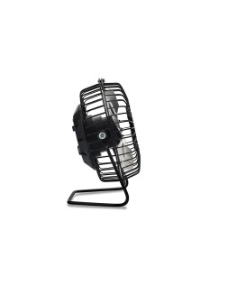 Mini-ventilador metálico de 4 pulgadas que refresca discretamente cualquier escritorio, mostrador o zona de cajas con un consumo mínimo de solo 3 W.Funciona a 5 V mediante el cable USB de 1 m (incluido), por lo que se ali menta sin problemas desde un portátil, power-bank o cargador de móvil. Incorpora rejilla protectora frontal y trasera y un soporte tubular reforzadoque evita vibraciones. Medidas: 14,9 x 9,4 x 15,5 cm. Color negro.