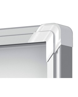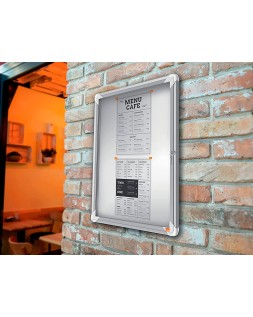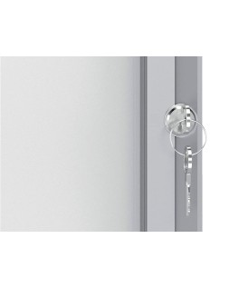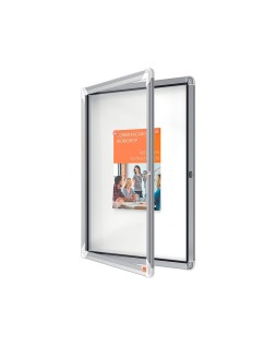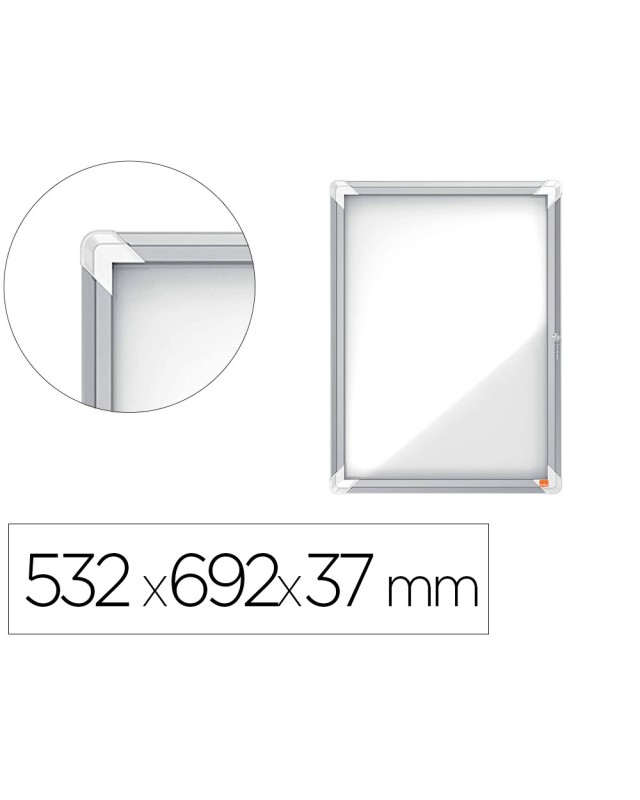 Vitrina con cerradura para interiores con superficie blanca magnética de borrado en seco y puerta de seguridad de cristal de 4 mm de grosor. Ideal para mostrar los documentos con seguridad. Optimizada para diversas hojas formato DIN A4. Bisagras laterales. Se suministra con los anclajes a la pared y dos llaves. Medidas 4 × A4. Medidas externas: 532×692×37 mm.