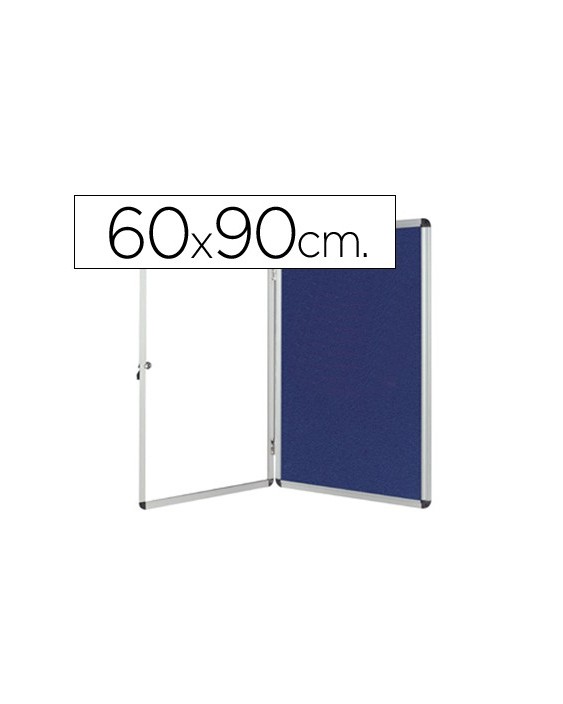 Con fondo azul, marco de aluminio y cantoneras redondeadas. Para uso en interiores. Marco con cerradura, incluye llaves de repuesto. Fieltro resistente al fuego. Puertas abatibles de metacrilato que ofrecen una excelente visibilidad. Ideal para colgar publicidad, notas, avisos, pósteres, etc., mediante chinchetas o velcro. Provista de accesorios para su fijación a la pared. Efecto lupa de la cerradura. Fondo: 4,5 cm.